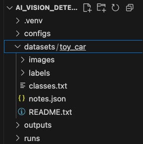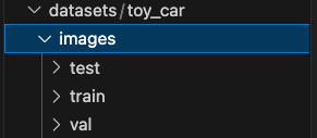 images နှင့် labels တွေအောက်မှာ train ၊ val နှင့် test ၃ခု ပေါ်လာပြီးတော့ toy_car ထဲကဖိုင်တွေကို ၃ နေရာခွဲထည့်လိုက်တာဖြစ်တယ်။ ပြီးရင် Dataset Folder Structure ကို Verify လုပ်ကြည့်မယ်။