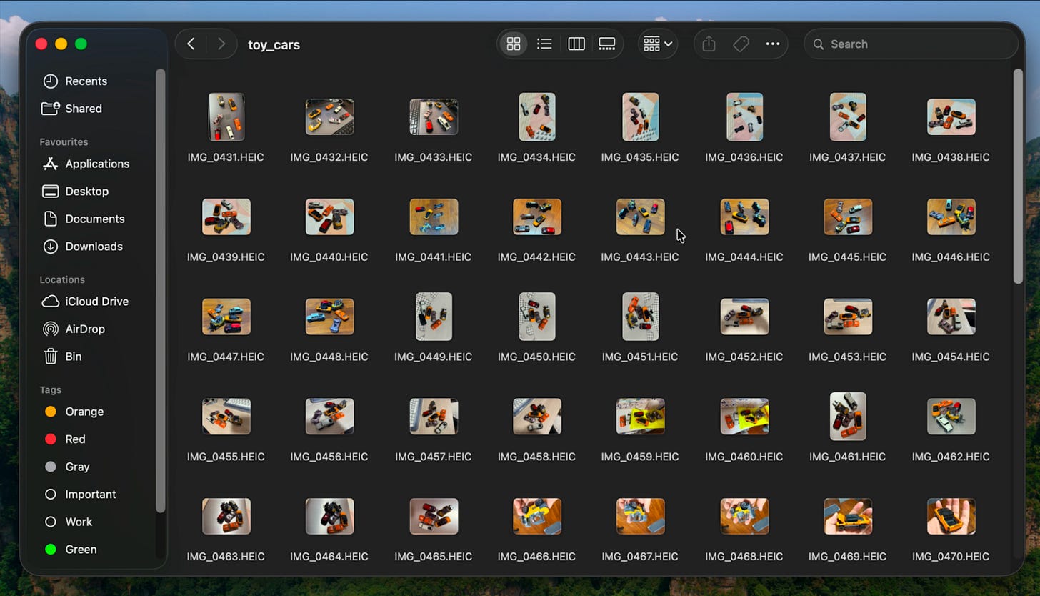ဆိုကြပါစို့ ကားတစ်စင်းကိုမြင်တာနှင့် ဒီကားဟာ ဘာအမျိုးအစားဆိုတာ AI သိနိုင်ဖို့ဆိုရင် သူ့မှာ ကားတွေနှင့်ပတ်သက်တဲ့ အချက်အလက်တွေရှိဖို့လိုတယ်။ အခု Prototype လေးကလည်း Toy Car လေးတွေကို Camera မှာပြလိုက်တာနှင့် ကားအမျိုးအစား ၆မျိုးထဲက ဘာကားအမျိုးအစားလဲဆိုတာ Classify လုပ်ပေးမှာဖြစ်တယ်။ အရင်ဆုံးဒီ Prototype အတွက် Toy Car ကားအမျိုးအစား ၆ မျိုးရဲ့ ရှုဒေါင့်မျိုးစုံ၊ အလင်းအမှောင်မျိုးစုံ၊ ဓါတ်ပုံစုစုပေါင်းပုံ ၉၀ ကို Phone Camera နှင့် ရိုက်ပြီးတော့ Data စတင်စုဆောင်းတယ်။ (ပိုတိကျချင်ရင်တော့ ပုံပေါင်း ၅၀၀ ကျော်လောက်စုဆောင်းသင့်တယ်။) ပုံတွေအကုန်လုံးကို yolo\toy_cars folder အောက်မှာထားလိုက်တယ်။