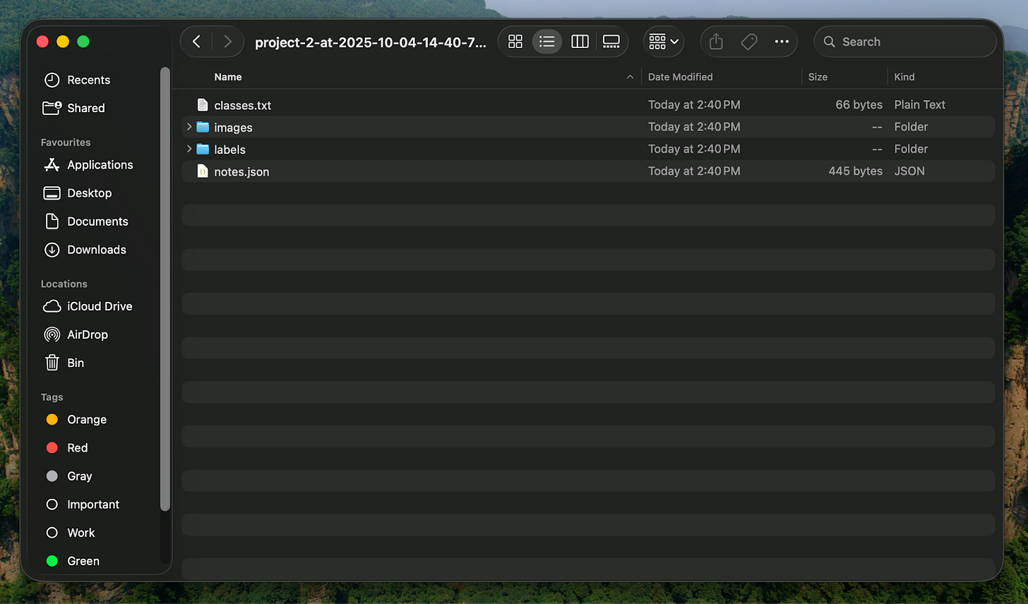 Export လုပ်တဲ့အခါ CV Model ထဲမှာ အသုံးပြုမယ့် Dataset အမျိုးအစားပေါ်မှာမူတည်ပြီး လုပ်ရမှာဖြစ်ပါတယ်။ ကျွန်တော့် Prototype ကတော့ YOLO Model အတွက်ဆိုတော့ YOLO with Images ကိုရွေးချယ်ပြီး Export လုပ်လိုက်ပါတယ်။ Export ပြီးရင် Zip ဖိုင်ထဲမှာ အခုလို images နှင့် labels Folder နှစ်ခုပါတဲ့ Dataset တစ်ခုရလာမှာဖြစ်ပါတယ်။