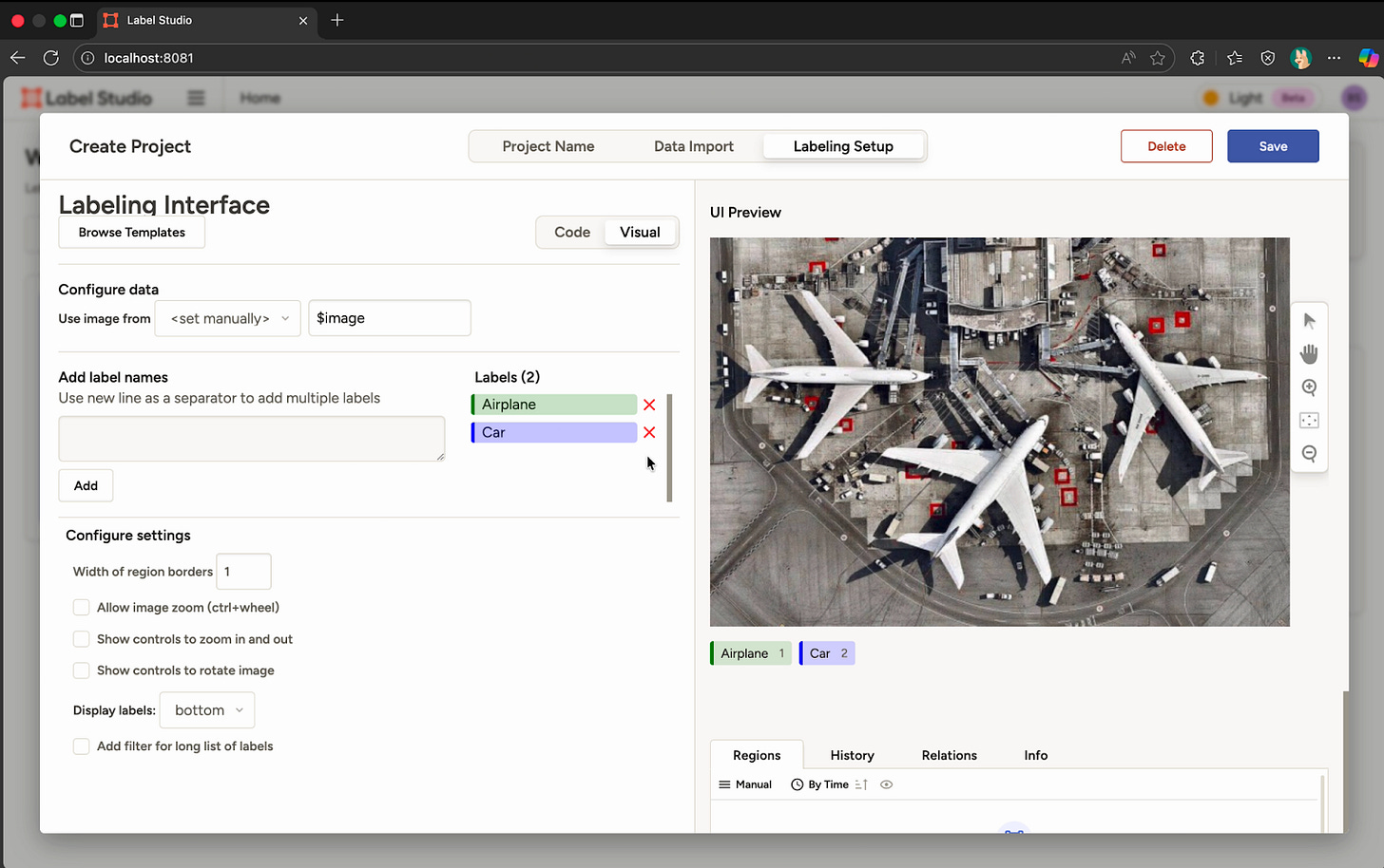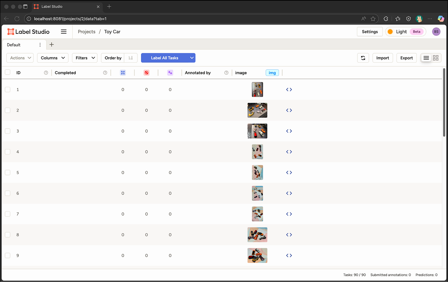 Label Setup မှာ အသုံးပြုမယ့် Label ပုံစံကိုရွေးပေးရမယ်။ CV အတွက်လား၊ LLM အတွက်လား၊ စသည်ဖြင့် Content အမျိုးအစားနှင့်ဆိုင်တဲ့ Label အမျိုးအစားကိုရွေးပေးရမှာဖြစ်တယ်။ အခုကျွန်တော့် Prototype က CV အတွက်ဖြစ်တာကြောင့်၊ Computer Vision (CV) ကိုရွေးလိုက်တယ်။ နောက်ထပ်ရွေးရမှာက ဘာကို Vision လုပ်မှာလဲဆိုတဲ့ အမျိုးအစားကိုထပ်ရွေးရမယ်။ စာသားတွေကို လုပ်မှာလား၊ အစိတ်အပိုင်းတစ်ခုကို လုပ်မှာလား၊ Tracking လုပ်မှာလား စသည်ဖြင့်ရွေးရမယ်။ ကျွန်တော့် Prototype မှာတော့ Image ထဲမှာမြင်ရတဲ့ Object တွေအတွက်လုပ်ချင်လို့ Object Detection with Bounding Boxes ကို ရွေးလိုက်တယ်။ နောက်ဆုံးမှာ Labeling Interface ထဲကို ပုံမှာမြင်ရတဲ့အတိုင်း ရောက်သွားတယ်။
